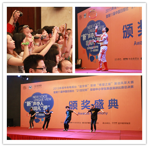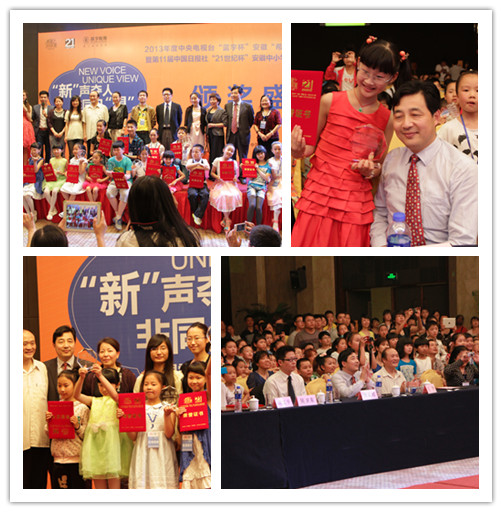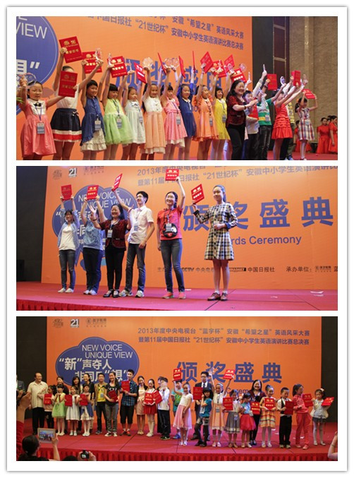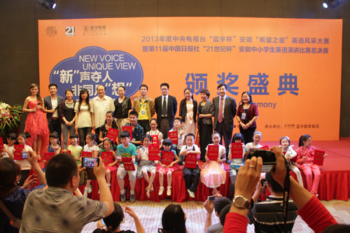 6月2日,2013年度中央电视台“蓝宇杯”安徽“希望之星”英语风采大赛暨第11届中国日报社“21世纪杯”安徽中小学生英语演讲比赛总决赛圆满落幕。小低组、小高组、初中组、高中组和大学组五个组别前五名选手将代表安徽参加中央电视台的总决赛。