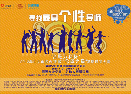“合肥万科杯”2013年中央电视台(安徽)“希望之星”英语风采大赛,已登陆全省十二大城市:合肥、蚌埠、芜湖、马鞍山、六安、安庆、巢湖、滁州、铜陵、淮南、阜阳、阜南,目前全省已有300多所大、中、小学及幼儿园积极参与,复赛报名盛况空前!