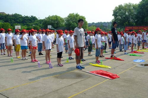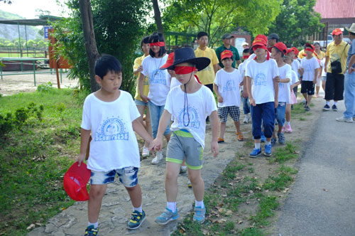 7月13日上午,举行了最后一个活动:“生命之旅”。教官随机地给小朋友们发放遮眼布,发到的孩子扮演盲人,剩下的孩子扮演哑人,哑人负责搀扶着盲人走过一段“生命的旅程”。