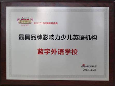 11月28日,在新浪教育频道主办的“2013中国教育盛典”上,蓝宇外语学校凭借其独特的教学模式和优秀的品牌影响力,获得广大学生、家长以及专家的喜爱和推荐,从全国数以万计参评的少儿英语培训机构中脱颖而出,一举斩获“2013年度最具品牌影响力少儿英语机构”荣誉称号。