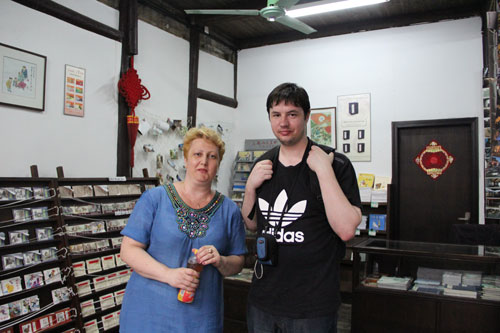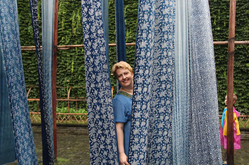 第二天,我们来到了美丽的江南水乡——乌镇。寻着《似水年华》的脚步,我们登上逢源双桥。传说踏走双桥有男左女右的习俗,走一遍桥,须分走左右两半,因此又演绎出走此桥便可左右逢源之说。从桥上下来后,我们直接去了蓝印花布染店作坊。一迈入庭院,就恍若置身于一个奇妙的世界,一幅幅长条形的蓝印花布直挂而下,微风吹过,便卷起片片花布,迤逦动人。或许是因为这些蓝印花布的风情太诱人,我们的外教Elena也忍不住穿行在其间,体味那别样的情愫。