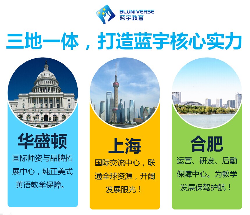 蓝宇在美国华盛顿设立国际师资与品牌拓展中心,在上海设立国际交流中心,在合肥设立运营中心、研发中心、后勤保障中心。