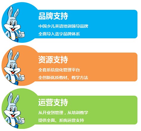 蓝宇教育集团,作为中国少儿英语培训的先行者和领导者,我们为加盟者设置了一套绿色、科学、规范的管理服务框架,拥有建全的制度、清晰的流程,任何细节都包含其中,保障了蓝宇所有校点有统一的教学质量和招生水平,让校区快速赢利,让投资者得到实惠。