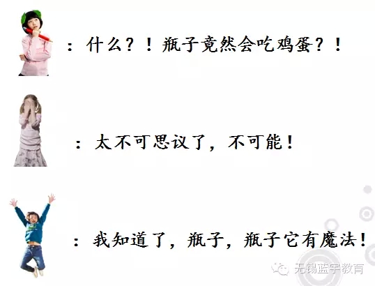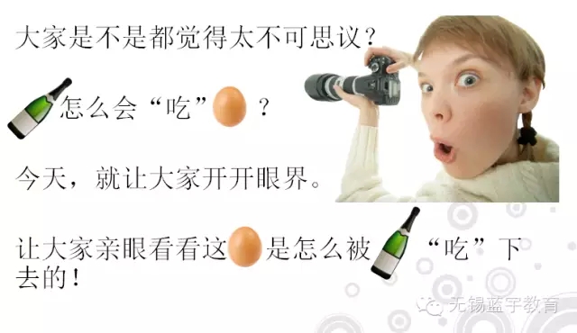 还记得Aaron将燃烧的纸片放入细口瓶中,其实是在给瓶子内的空气加热,这样就造成瓶子内压小,外压大。所以当Aaron把鸡蛋快速放入瓶口时,瓶内温度降低,压力变小,空气就把鸡蛋压入了瓶内。宝贝们,你们明白了吗?