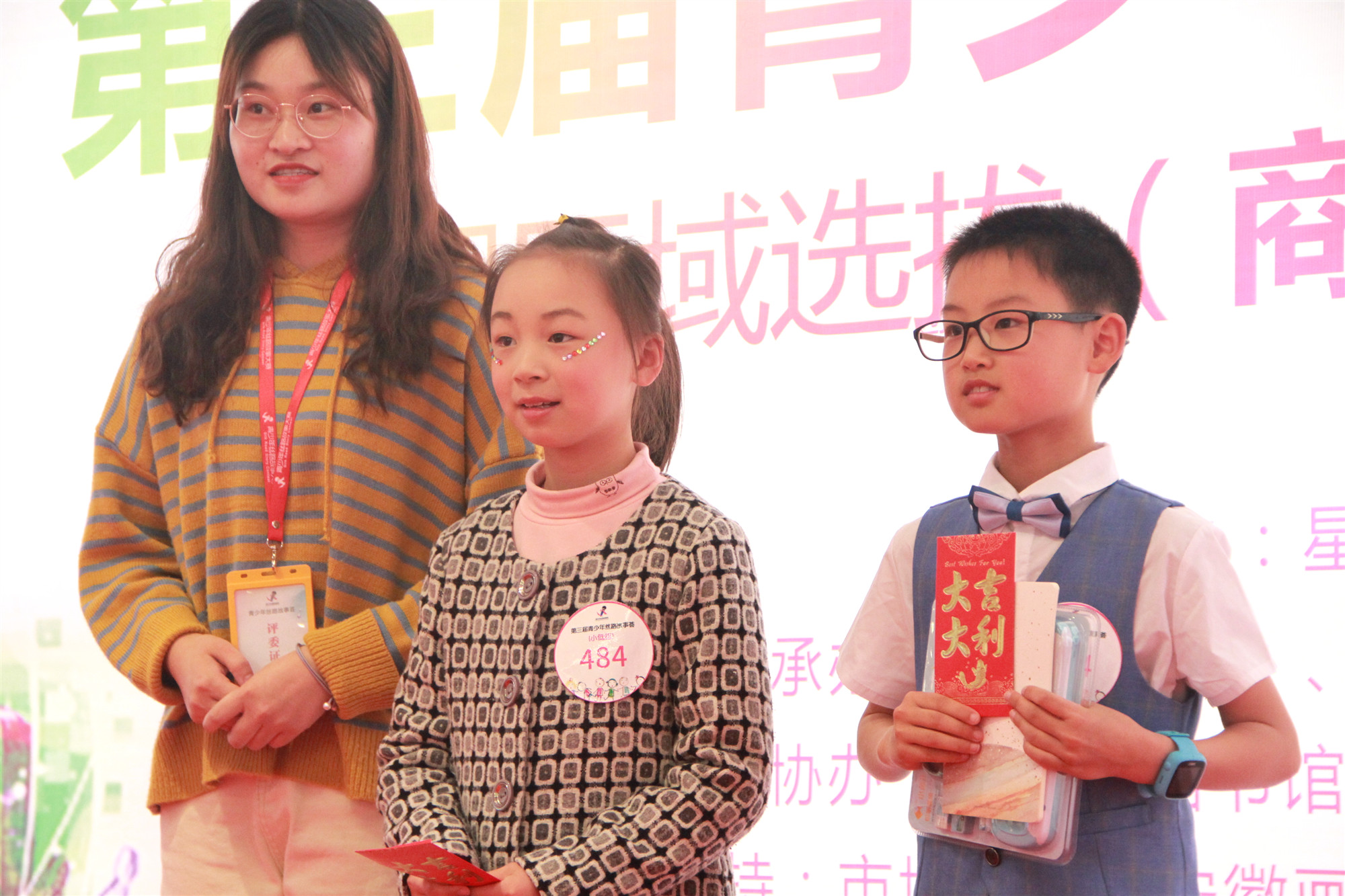 如市场星报和安徽少儿出版社提供的精美图书:现场被抽中获得图书的小选手在舞台上开心地说:“我平时就非常喜欢读书,今天能抽到这样的奖品,实在是太开心了!”