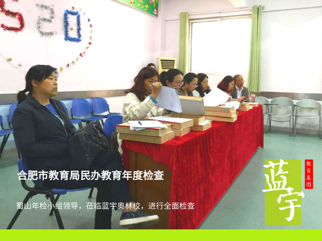 在5月初,蜀山区教育局民办教育机构年检领导小组,就来到了蓝宇外语学校奥林校,蓝宇教育集团的行政、教务等多个部门负责人,全程陪同,积极配合!