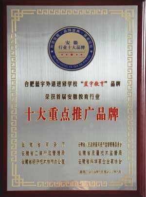 2008年7月28日,在省商务厅、省国资委、省工商局、省质监局、省经协办和省科学家企业家协会联合举办的“和谐安徽 品牌盛典 强省论坛”活动中,“蓝宇教育”被授予“首届安徽教育行业十大重点推广品牌”称号,并在《安徽日报》等省内主流新闻媒体上进行了公告。公司领导应邀参加了组委会在省人大会议中心举行的主题为“科学发展与优秀品牌创立同步,加速崛起与发展经济强省同行”的安徽强省品牌发布和安徽品牌发展主题报告会,捧回了由省领导颁发的“首届安徽教育行业十大重点推广品牌”奖牌。